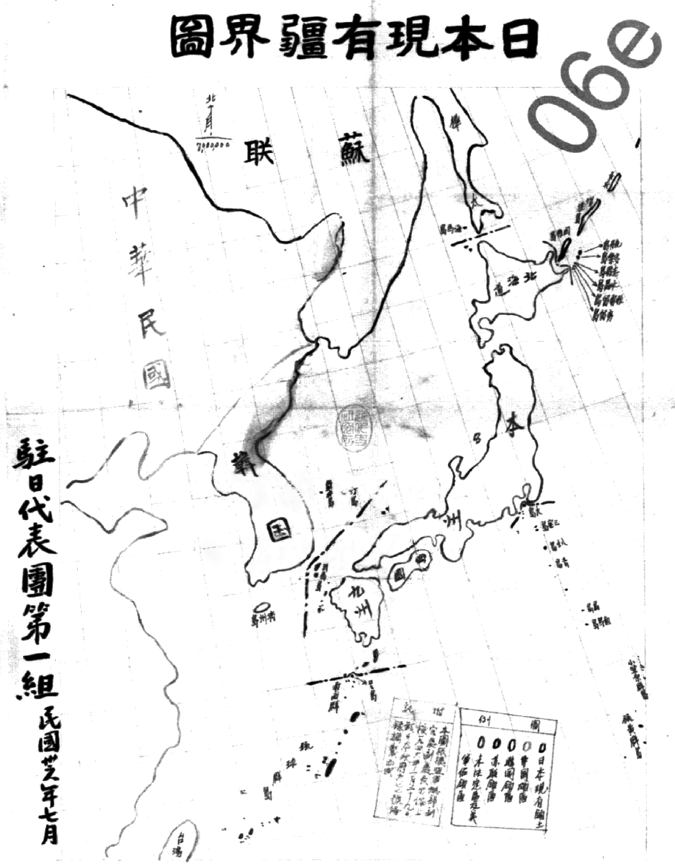 处置被法西斯国家侵占的领土是盟国建立战后秩序的重要内容。战时盟国在一系列的重要会议上,就法西斯侵略而带来的领土变更提出了处置的原则和办法,《开罗宣言》和《波茨坦公告》则确定了战后对日本领土处置的基本原则方针。1943年12月盟国发表的开罗会议宣言明确规定剥夺日本侵略扩张所攫取的领土:一是自1914年第一次世界大战以来在太平洋所夺得或占领之一切岛域;二是日本所窃取于中国之领土,例如满洲、台湾、澎湖列岛等,归还中华民国;三是日本的殖民地朝鲜获得独立;四是日本亦将被逐出于其以暴力或贪欲所攫取之所有土地。其中,“日本亦将被逐出于其以暴力或贪欲所攫取之所有土地”,就是剥夺日本自明治维新后“以暴力或贪欲所攫取之所有土地”,自然就包括日本1879年吞并的琉球群岛和第一次世界大战期间占领的太平洋岛屿;还包括日本趁甲午战争打败中国之机,于1895年秘密强占的中国钓鱼岛、韩国独岛,以及通过马关条约强迫清政府割让的台湾等中国领土。1945年7月26日,中美英三国在《促令日本投降之波茨坦公告》(简称《波茨坦公告》)中重申“开罗会议之条件必将实施,而日本之主权必将限于本州、北海道、九州、四国及吾人所决定其他小岛之内。”1946年1月29日,《联合国最高司令部训令第677号》具体规定了日本版图的范围,即“日本国土是以四个主岛及其邻接之约1000个小岛、对马岛及北纬三十度以北之琉球(南西)诸岛(不含口岛)构成”。同日,盟总向日本下达《某些外围地区的政府和管理与日本分离的备忘录》(简称《备忘录》),具体规定了日本领土范围。根据盟军总部指令,中国驻日代表团绘制了日本疆域图(见图一) 。