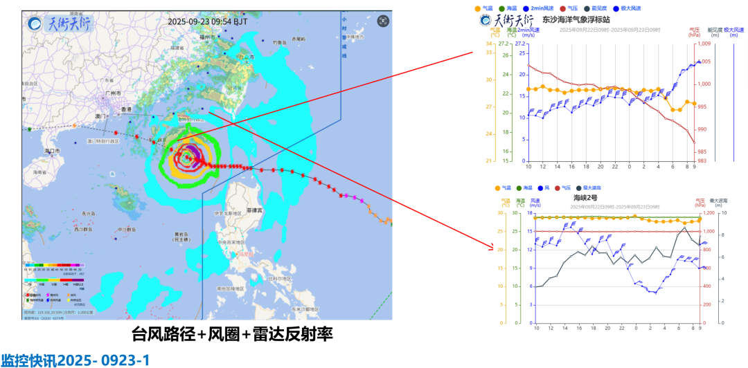 监测结果:23日9时54分,超强台风“桦加沙” 最大出现16级风圈,大风区集中在台风中心东侧。东沙海洋气象浮标站和海峡2号浮标站自2时起风速不断增大,波高不断增加。东沙海洋气象浮标站风速最大达22.2米/秒。海峡2号浮标站最大波高达7.9米。