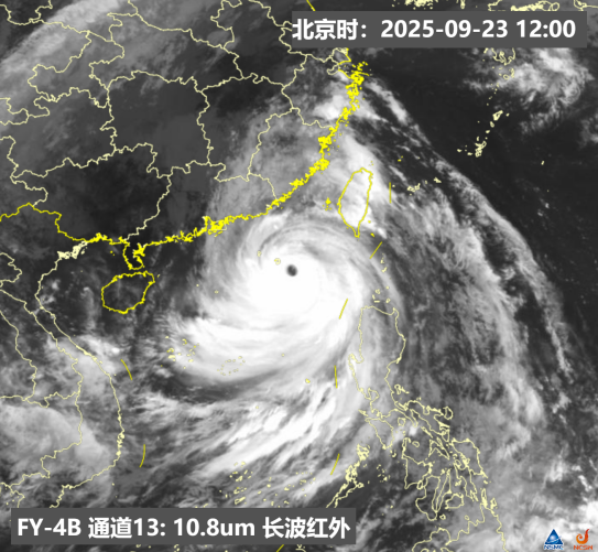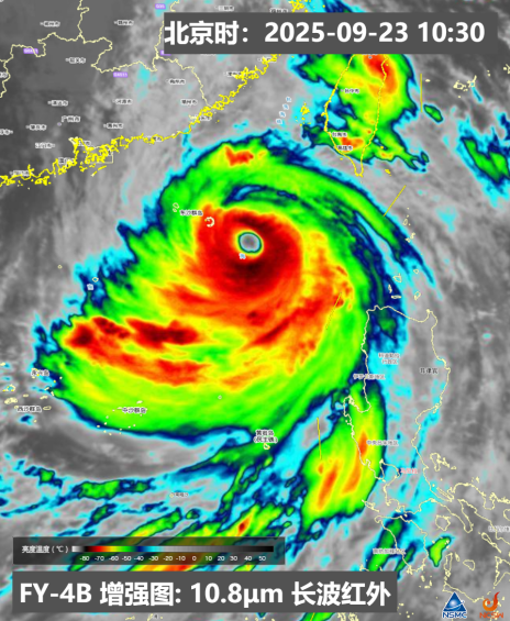 上图为风云四号B星的红外云图和红外增强云图,卫星成像仪对地球和大气扫描,观测扫描点上发射的长波红外辐射强度,根据反射辐射强度的不同而得到的云和地表的分布图像,就是红外云图。其波长范围位于10.3至11.3微米之间。在一般的红外云图中,浅色调区域代表着较小的红外辐射和较低的温度,而暗色调区域则表示红外辐射强烈、温度较高。云顶越高,其温度越低,在红外云图上会呈现出更白的色调。而在红外增强云图中能够进一步凸显台风的结构特征,红外增强云图中主要关注-20至-80℃的亮温区间,颜色越偏暖偏红,说明亮温越低,对流发展越旺盛,颜色越偏冷偏蓝,则说明亮温越高。