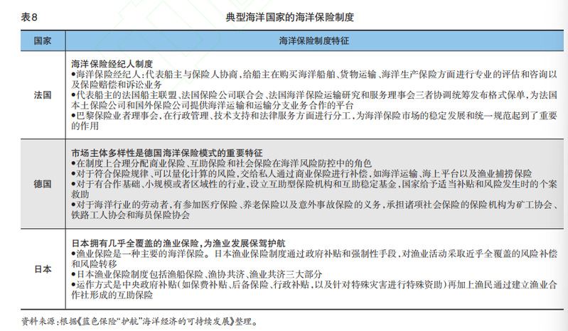 保险是风险管理的重要手段,海洋经济的高风险性使得海洋保险的重要性更加突出。海洋强国大多拥有完善的海洋保险制度。法国、德国和日本的海洋保险制度各有特点和侧重(见表8)。法国实行的是海洋保险经纪人制度,即海洋保险经纪人代表船主与保险人协商,为船主在购买海洋船舶、货物运输、海洋生产保险方面提供专业的评估和咨询,以及保险赔偿和诉讼业务。德国海洋保险制度的主要特征是市场主体多样化,即在制度上合理分配商业保险、互助保险和社会保险在海洋风险防控中的角色。日本渔业保险发展成熟,几乎全覆盖,包括渔船保险、渔协共济、渔业共济三大部分,通过政府补贴和强制性手段对渔业活动采取近乎全覆盖的风险补偿和风险转移。