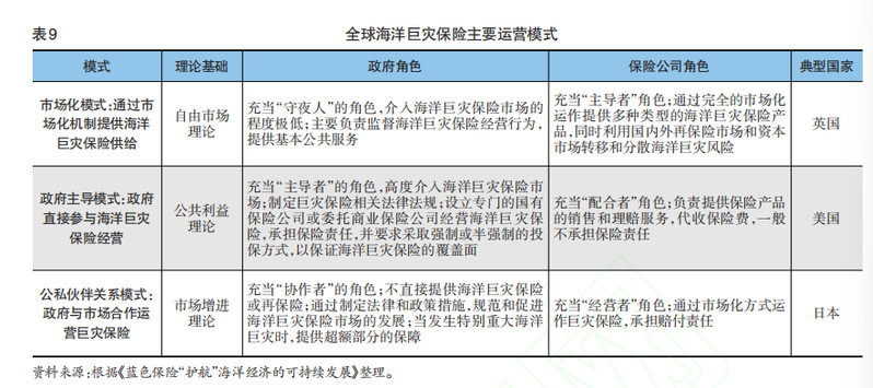 全球海洋巨灾保险主要运营模式有三种,分别为市场化模式、政府主导模式和公私伙伴关系模式,典型国家分别为英国、美国、日本(见表9)。市场化模式以自由市场理论为基础,强调通过市场化机制提供海洋巨灾保险。政府主导模式以公共利益理论为基础,强调政府直接高度参与海洋巨灾保险经营。公私伙伴关系模式以市场增进理论为基础,强调政府与市场合作共同运营巨灾保险。