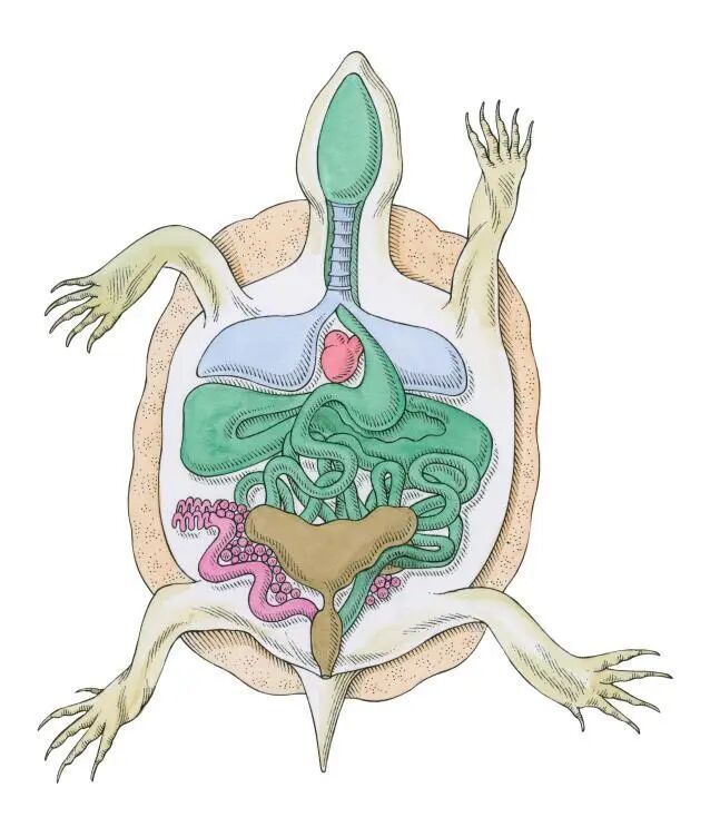 和人类一样,海龟的心脏有四个腔室,不过海龟有两条主动脉,负责输送血液到身体不同部位,这种独特的血液循环系统适应了它们在水中的生活。海龟的肺不仅用于吸收氧气,还可作为浮力装置,帮助它们在水中自由沉浮。和其他爬虫类一样,海龟的肠道、膀胱以及雌龟的输卵管开口全都位于短管状的泄殖腔内,这是一种高效而紧凑的生理结构。雌海龟有两个卵巢,共有4000个微小的卵。卵在输卵管受精,并待在输卵管直到卵壳形成、准备排出。泄殖腔是一种多功能的孔口,既用于排泄,也用于下蛋。某些乌龟品种还有泄殖腔囊,可用来摄取氧气,展现了生命的奇妙适应性。雄海龟的尾巴较雌海龟长,这一特征在交配时发挥了重要作用,可以帮助它们抱握雌海龟,完成繁衍后代的使命。