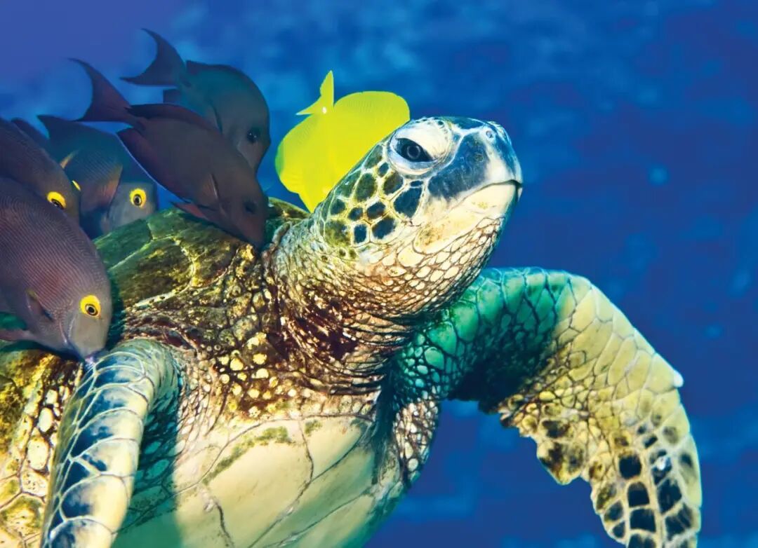 由于背上覆有龟壳,海龟在保持身体清洁方面需要借助一点外力。它们的身上总是长满了藻类、外寄生虫和藤壶等附着物。这时,隆头鱼、刺尾鱼等专司清洁工作的鱼类便会游近海龟身边,帮忙清除海龟身上的尘垢,而它们在这个过程中也能顺便饱餐一顿。虽然这显然是一种互利关系,但也有人担心清洁鱼可能会传播疾病给海龟,这也为海龟的生存增添了一丝不确定因素。