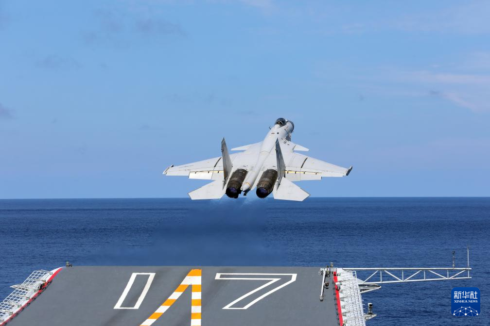 这是山东舰舰载战斗机滑越起飞。图源 / 新华社
