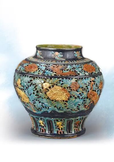 珐华贴金镂空孔雀牡丹纹大罐。