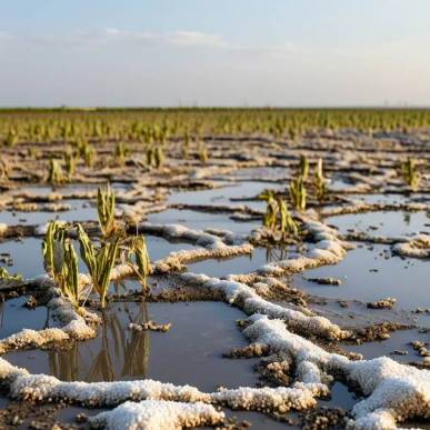 《盐水入侵对农业的影响》——土壤盐分的增加导致农作物无法正常生长,严重影响了农业生产和农民的生计。